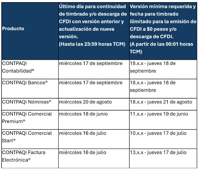 Te informamos que si adquieres la nueva versión podrás aprovechar el periodo de facilidad de instalación y activación de versiones mayores de sistemas con licenciamiento tradicional, la cual, finalizará el 15 de diciembre 2025 a las 23:59 hrs (TCM), esto con motivo de las acciones de continuidad de timbrado que se estarán efectuando durante los meses de junio a septiembre de 2025, por lo que se establece que a esta fecha se dejarán de emitir CFDI y/o descargar comprobantes.