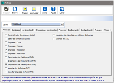 Desmarca las casillas a las que el perfil no tendrá derecho de uso. Realiza esto por cada una de las pestañas disponibles. Guarda los cambios y cierra la ventana.