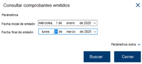 -Si seleccionamos Emitidos, podemos seleccionar fecha inicial y fecha final en el filtro, damos clic en Buscar