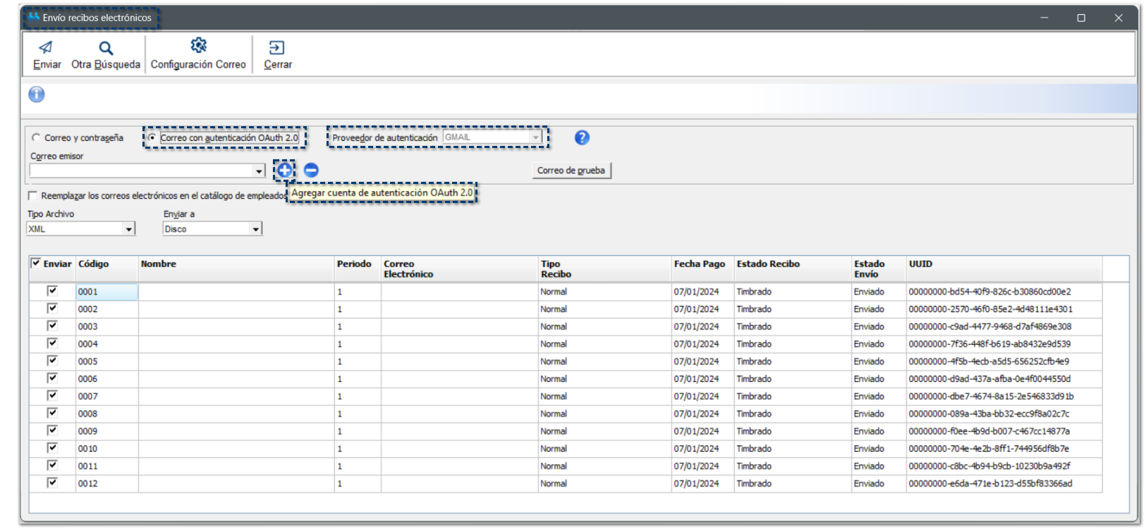- A partir de que instales la versión 18.0.1 de CONTPAQi Nóminas®, y ejecutes el proceso de Envío masivo de recibos electrónicos, visualizarás que dentro de este módulo se agrega el parámetro Correo con autenticación OAuth 2.0.