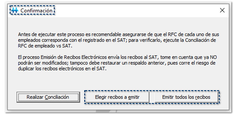 Al ingresar al menú Procesos y seleccionar el submenú Emisión de recibos electrónicos, se mostrará en la ventana de confirmación una nueva opción para elegir los recibos a emitir o emitir todos los recibos: