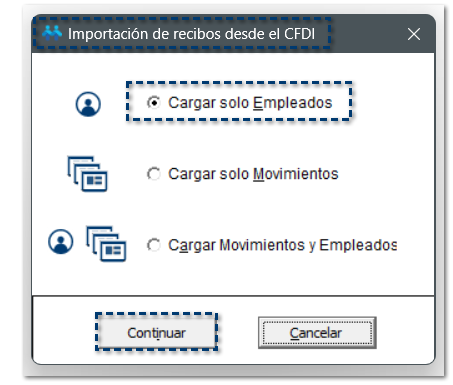 Esta opción permite importar tanto el catálogo de empleados como los movimientos de los CFDI de nómina en un solo proceso.